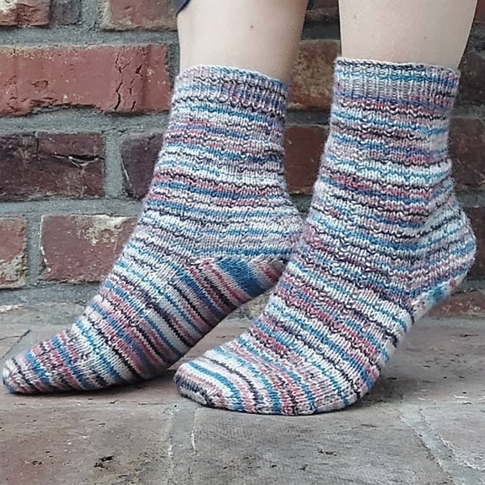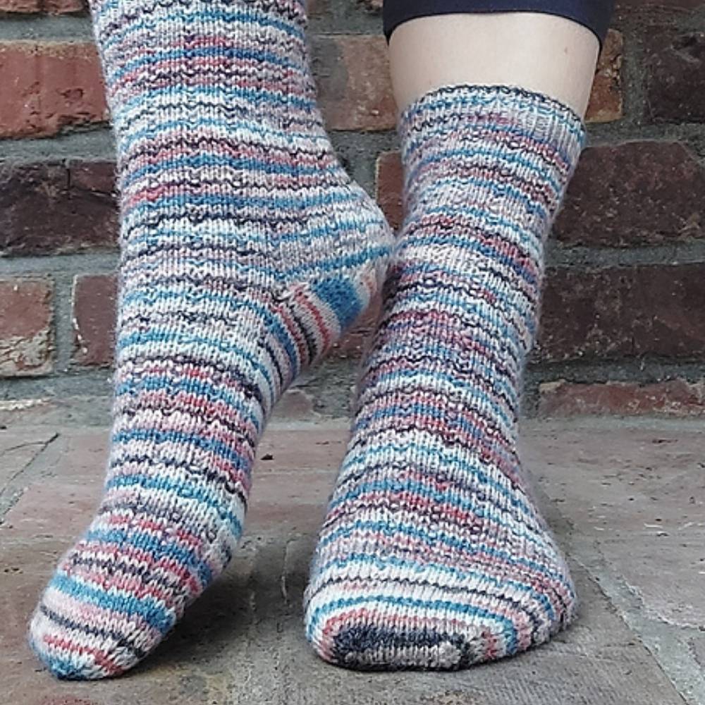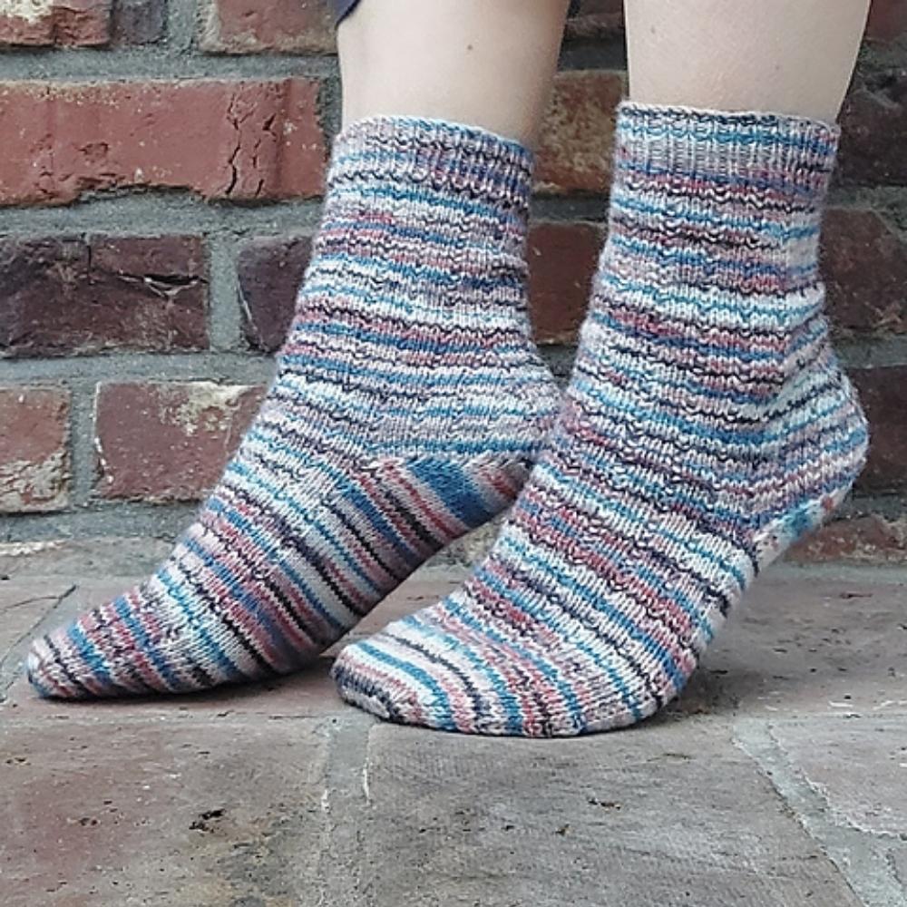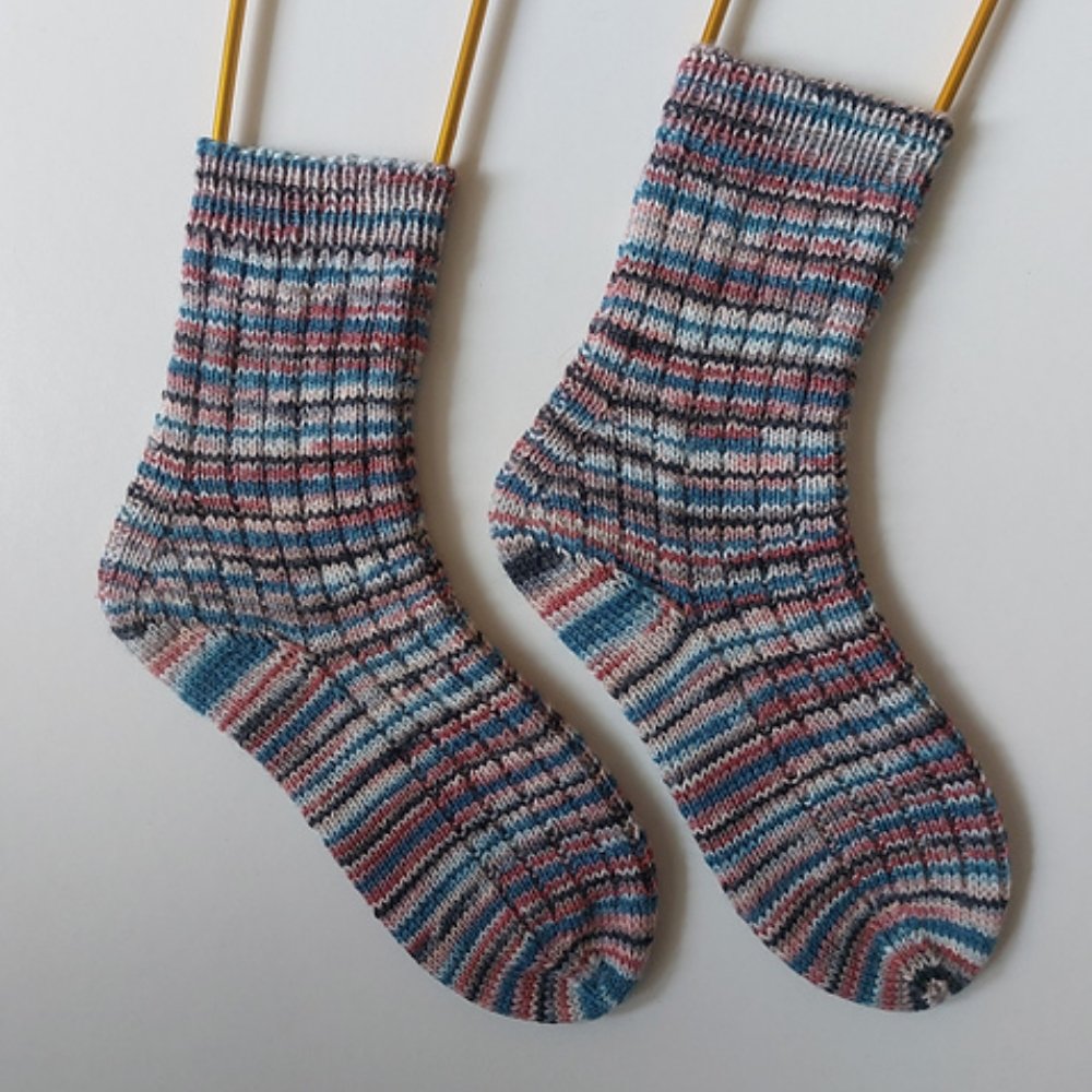 PARI socks - Das wunderschöne Garn für die Socken war ein Mitbringsel aus PARIs, zufällig auch noch in den Farben der französischen Flagge. Sie sind im einfachen 1x3-BRP-Muster (engl. “broken rib pattern” - durchbrochenes Rippenmuster) gestrickt - die perfekte Leinwand für besondere, z. B. handgefärbte Sockengarne. Das elastische Rippenmuster sorgt für einen guten Sitz und eine bequeme Passform. Die Socken werden am Bündchen begonnen und die Zunahmeferse passt hervorragend zu gemusterten Garnen, da keine ungewollte Unterbrechung des Musters an der Ferse erzeugt wird. Außerdem ergibt die Zunahmeferse viel Weite und eignet sich deshalb gut für Füße mit einem hohen Spann. Abgeschlossen werden die Socken mit einer klassischen, runden Bandspitze.