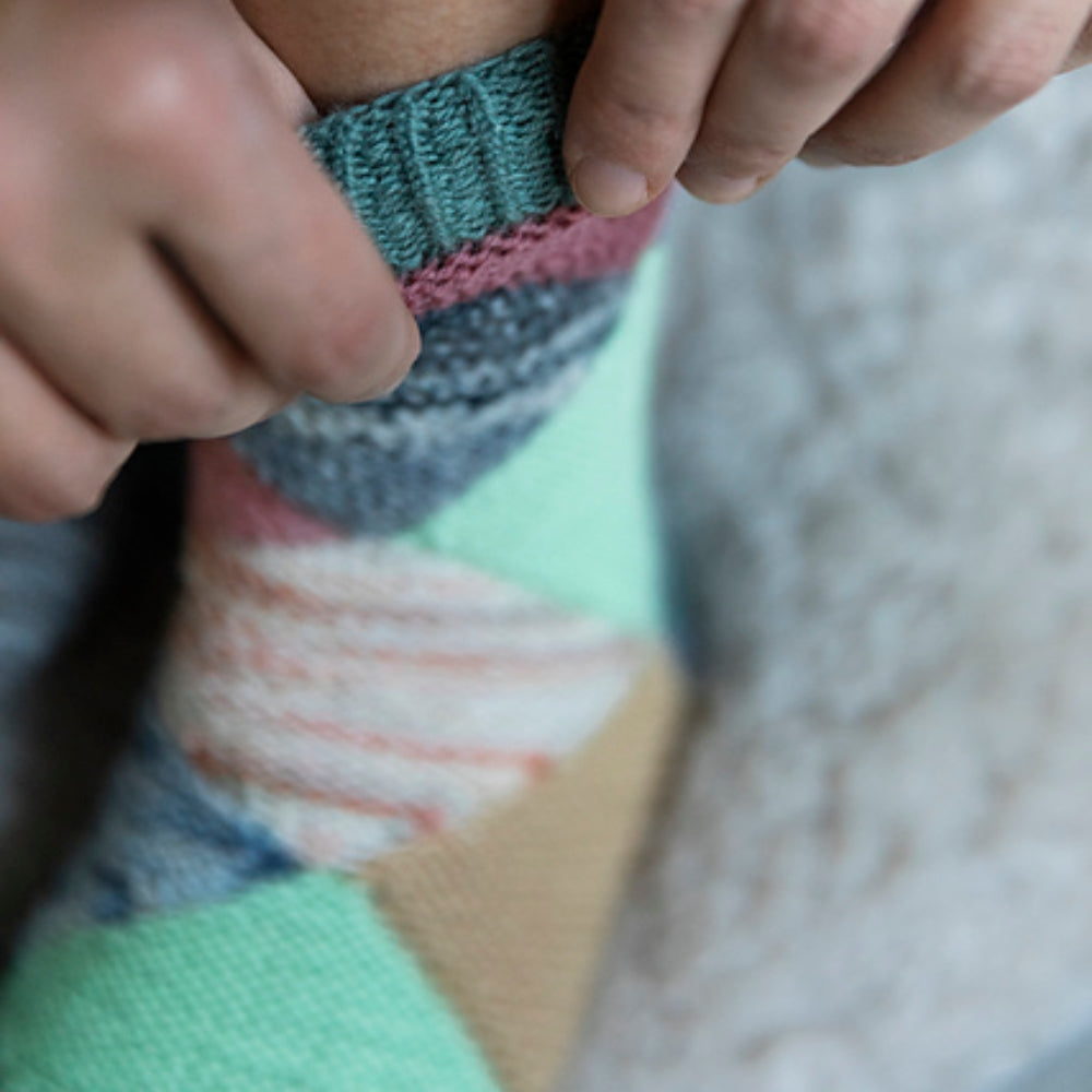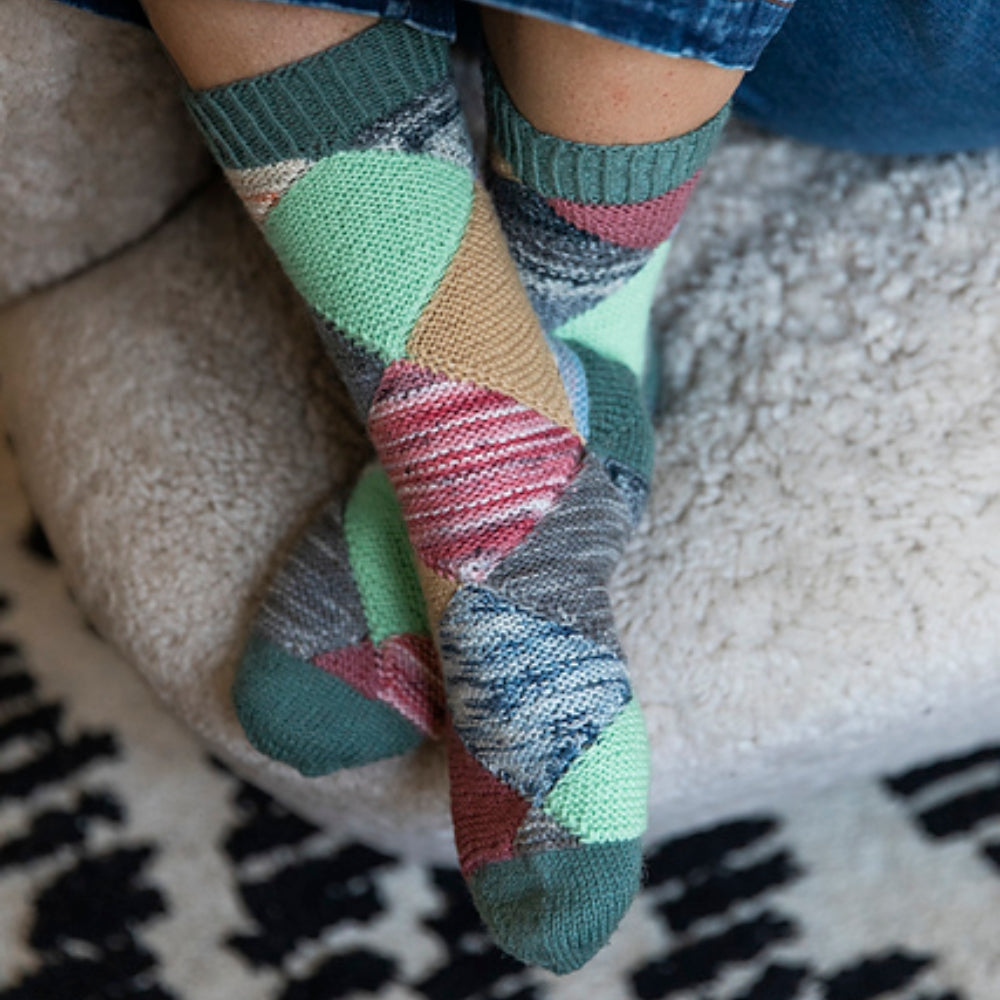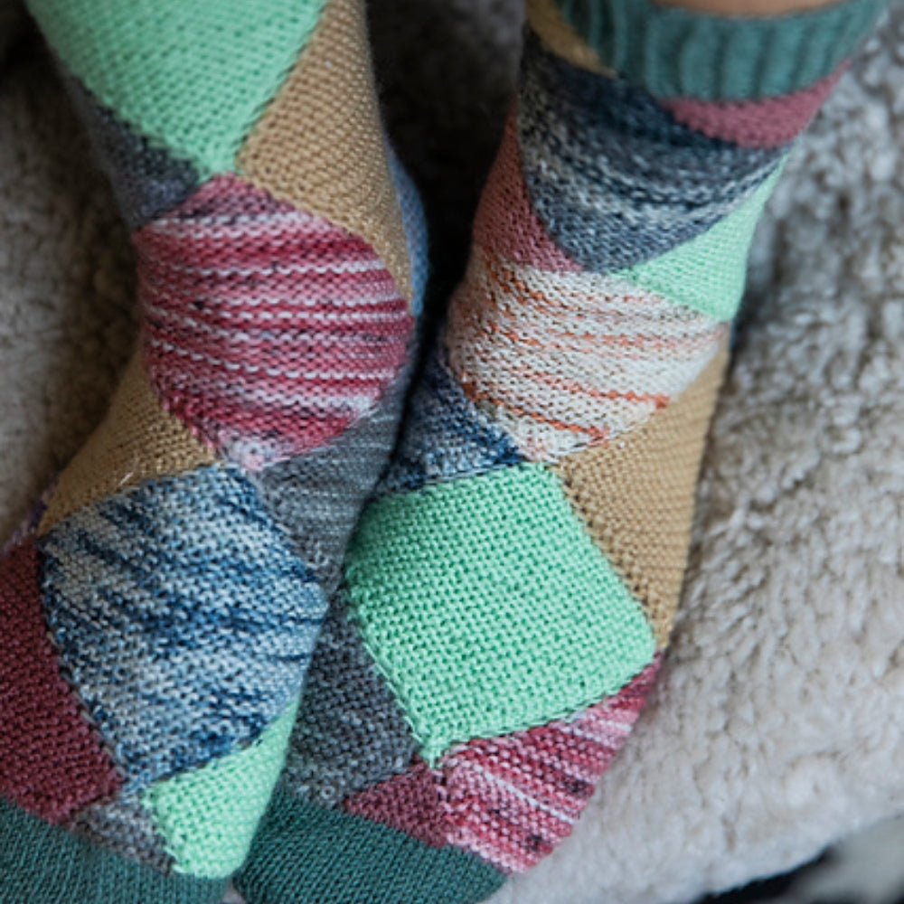These socks are worked from cuff to toe. The cuff is worked in Half-Twisted Rib in the round. Then, you work flat, beginning with two triangles and then two squares, all worked in Garter Stitch. After the leg is finished, you work a shadow-wrap Stockinette Stitch heel before setting up for the foot and continuing as established for the leg. Finally, you begin working in the round again and work the toe in Stockinette Stitch.