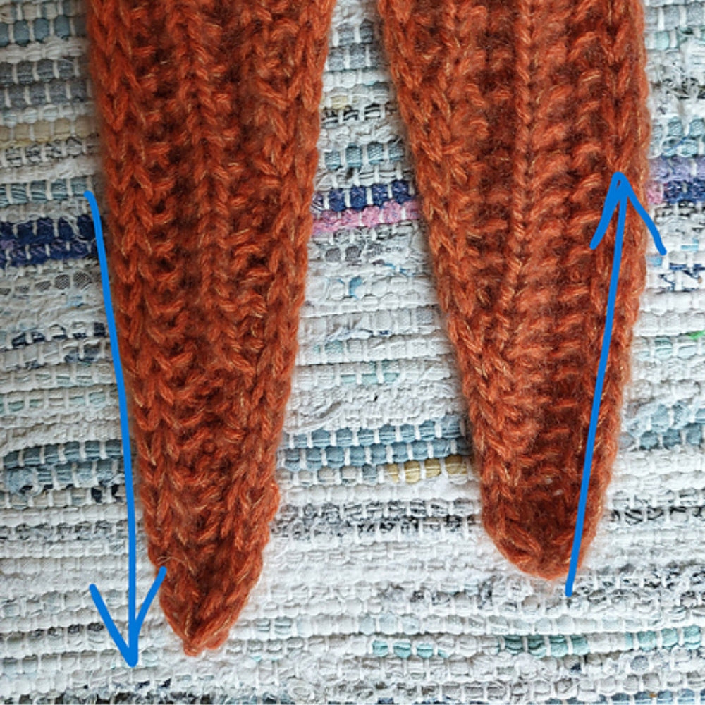 Beispiel 2 (orange): 24 M x 32 Reihen = 10 x 10 cm im falschen Patentmuster, gemessen nach dem Waschen und Spannen