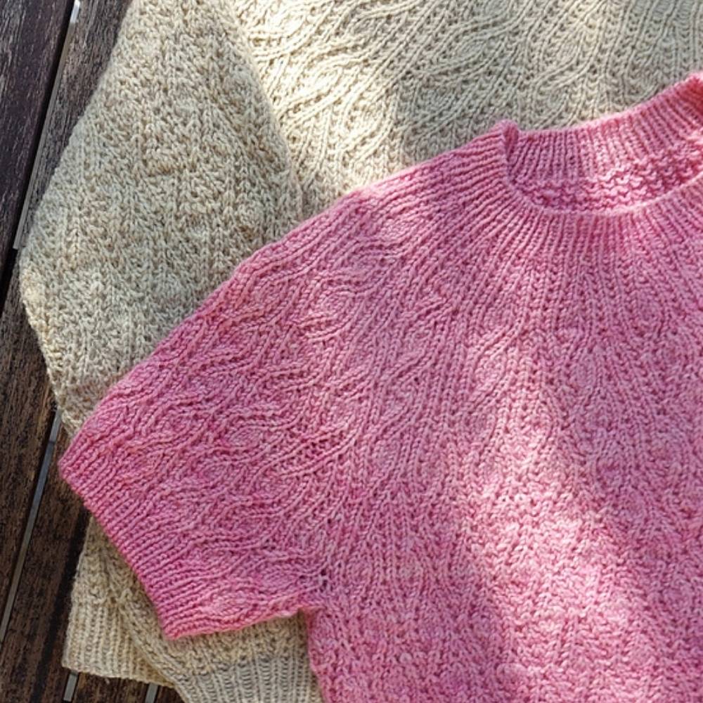 Garn in DK-Stärke. (Für den Beispielpullover in Größe 2 wurden etwa 1.200 m verbraucht, da er mit 32 cm Seitenlänge kürzer geschnitten ist.)
