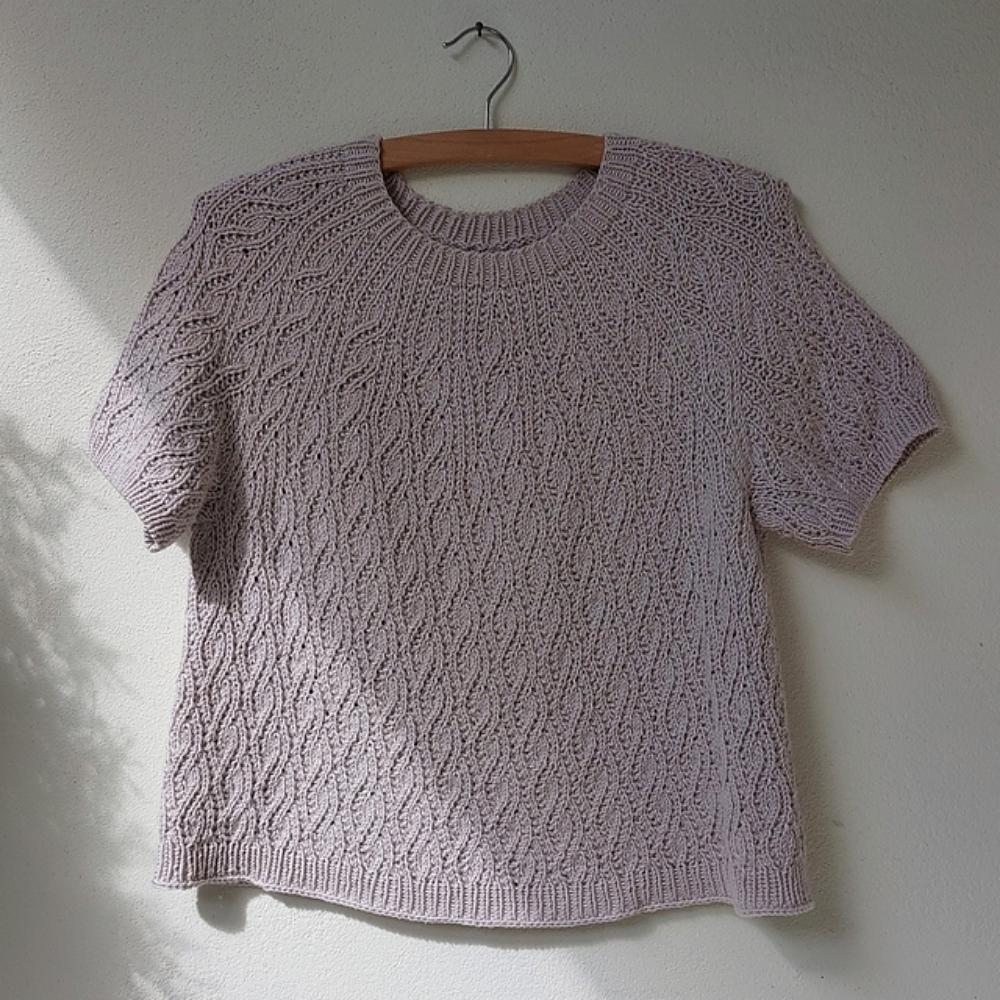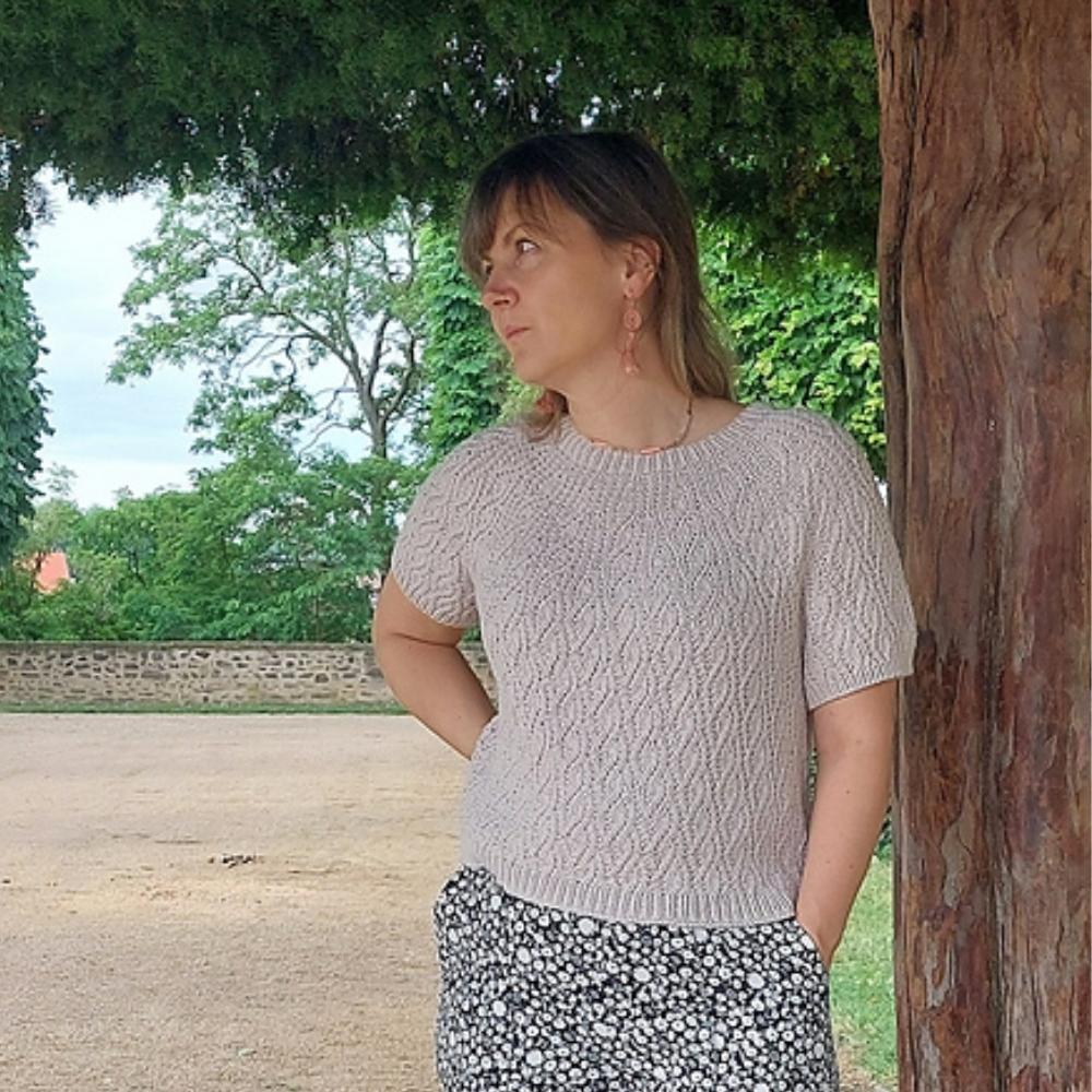 Der FREYA sweater ist durchgehend in einem „falschen“ Zopfmuster gearbeitet, das allein mithilfe von Zunahmen und Abnahmen entsteht. Begonnen wird der von oben nach unten gestrickte Rundpassenpullover mit einem Rundhalsausschnitt im 1x1-Rippenmuster. Als Nächstes nimmst du Maschen zu, um das Zopfmuster entstehen zu lassen, einen Mustersatz nach dem anderen, gleichmäßig um die gesamte Passe herum. Nachdem du ein Stück auf diese Weise gearbeitet hast, markierst du vier Raglanlinien und baust Zunahmen in jedes Zopfmotiv ein, bis daraus neue Zopfmustermotive hervorgegangen sind. Um den Halsausschnitt am Nacken etwas anzuheben, strickst du eine zusätzliche Wiederholung des Musters nur über die Rückenmaschen. Dann teilst du die Ärmel ab, legst die Ärmelmaschen still und schlägst neue Maschen für die untere Kante des Armausschnitts an. Diese werden in das Zopfmuster integriert, während du den Rumpf in der Runde strickst, der schließlich mit einem 1x1-Rippenbündchen abgeschlossen wird. Die Ärmel werden ebenfalls in der Runde gestrickt und erhalten ein Bündchen im 1x1-Rippenmuster. Für einen besonders sauberen Abschluss können alle Rippenbündchen italienisch abgekettet werden. Die Anleitung enthält außerdem Anweisungen für eine sommerliche T-Shirt-Variante mit kurzen Ärmeln.