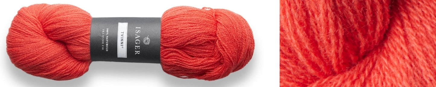 ISAGER TVINNI wurde von Marianne Isager zusammen mit der dänischen Spinnerei Skive Uldspinderi (auf Englisch: Henrichsen’s Wool Mill) entwickelt. Es besteht aus feinster Merinowolle, reiner Schurwolle, die aus der Erstschur von Lämmern gewonnen wird. Die langen und feinen Fasern ergeben eine besonders strapazierfähige Qualität. ISAGER beschreibt Tvinni als ihr edelstes Garn, das mit der Zeit schön altert. Ein Pullover, der aus Tvinni gestrickt wird, hat eine lange Lebensdauer, wenn er sorgfältig behandelt wird. Da es sich um ein zweifädiges Garn handelt, eignet es sich besonders gut zum Stricken von glatt rechts in Runden. Aufgrund seines geringen Gewichts kann es allein oder in Kombination mit anderen Qualitäten, z. B. für Fair-Isle- oder Norweger-Strickmuster, verwendet werden.