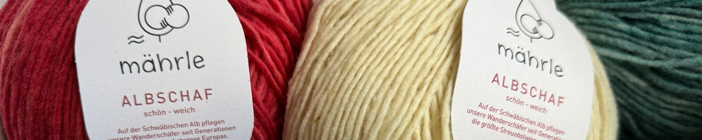 Die Albschafe sind Merinolandschafe. Ihre Wolle fühlt sich weich an. Inspiriert durch die frühlingshaften Wiesen der Schwäbischen Alb hat Mährle diese Garnlinie leuchtenden Farben mit Batikoptik gefärbt. Sie hat eine Lauflänge von 180m auf 100g und ist als Dochtgarn gesponnen. Die empfohlene Nadelstärke liegt zwischen 5 bis 6.