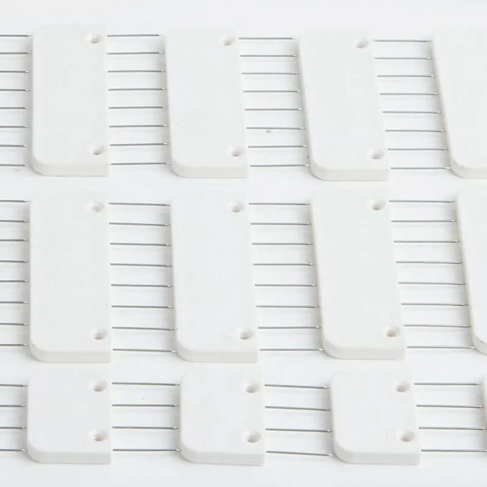 Durch die Löcher der Kämme kann eine Schnur gezogen werden. So kann die gleichmäßige Spannung entlang des Randes noch besser reguliert werden. Diese Spannkämme aus strapazierfähigem Kunststoff und rostfreie Metallnadeln helfen dir bei der Perfektionierung deiner Handarbeitsergebnisse.